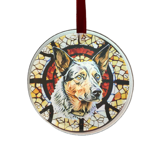 This adorable ornament is the perfect size for a medal, memorial gift, holiday ornament, OR sun-catcher! It is 3" in diameter and is made of glass. Each design is created with thought to highlight the dog and comes with satin ribbon.